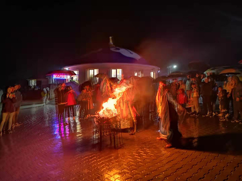 我们入住特色蒙古包休息(1413蒙古包嘿嘿),外面有点小雨了,冒着风雨(蒙古草原晚上真的好冷)我们来到篝火晚会地点,由于雨势太大,点了篝火,大家围绕着走了一圈,就结束了(一脸懵,我想象中大家载歌载舞的大口喝酒大碗吃肉的场景就这么结束了),稍许败兴的回到蒙古包睡觉了。