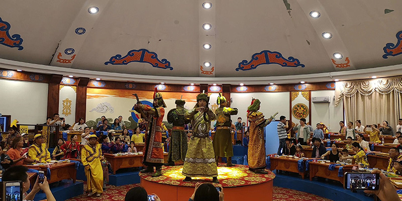 踏上归途,我们回到了蒙古包,此时夜色降临准备参加蒙古王宫贵族宫廷盛宴-诈马宴,首先我们cosplay成蒙古贵族(穿上特色蒙古贵族服装,当然了由于有点瘦,驾驭不了蒙古大汉那种粗狂的气质,但胜在新奇感),然后我们入席参加盛宴,桌上布满了各种点心和马奶酒,拉起悠扬的马头琴,唱着心醉的蒙古歌曲,看着萨满的表演,高潮迭起的蒙古摔跤比赛,呼麦,长调,哈达敬酒,吃着美味的食物,啃着烤全羊,尽情的陶醉在歌舞的海洋里,很快盛宴到达尾声。