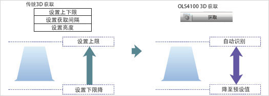 要使用智能扫描模式获取影像时,只需一键操作即可。由于智能扫描会自动调整Z 轴方向的设置,Z 轴方向的影像获取可以仅局限在所需的区域,因此可以在进行大范围大功率观察时节省很多时间。