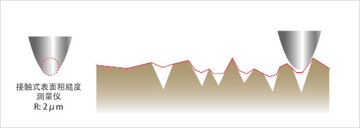 使用接触式表面粗糙度测量仪,无法测量比探针的针尖直径更细微的表面轮廓。而OLS4100 有着微小的激光光斑直径,所以能够对微细形状进行高分辨率的粗糙度测量。