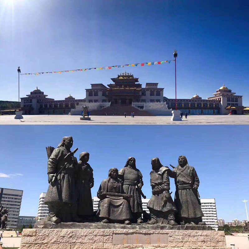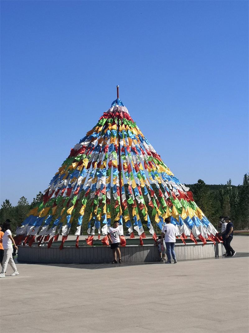 简单休息,我们随着大巴来到了康巴什新区成吉思汗政府广场,在导游的讲解下,成吉思汗在蒙古人民心里是圣祖,是长生天的象征,我们看到了成吉思汗的各种雕像,还有好多蒙古族衣服体验拍照的和卖玩具的,很有特色,漫步于乌兰木伦湖畔,欣赏了很多壁画,沿途拍到了很多特色的花(见识有限,认识的只有郁金香,-_-||),时间有限的我们再次踏上了去乌兰活佛府的大巴上,下车后看见很多旗帜组成的蒙古包,因为大殿维修的缘故,很可惜我们只参观了偏殿,蒙古族的宗教文化果然和汉族的文化不一样,金碧辉煌,很有特色,可能因为参观时间较短总觉得缺少了一些佛教的神圣和肃穆(不准拍照,所以没法给大家分享照片啦,O(∩_∩)O)。