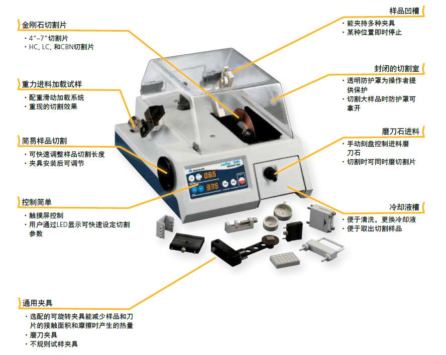 - 可移动冷却液槽能迅速清洗,便于取出切下的样品