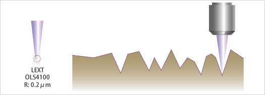 使用接触式表面粗糙度测量仪,无法测量比探针的针尖直径更细微的表面轮廓。而OLS4100 有着微小的激光光斑直径,所以能够对微细形状进行高分辨率的粗糙度测量。